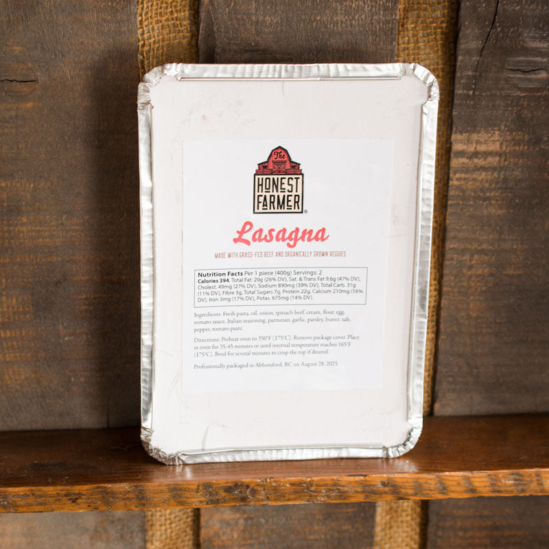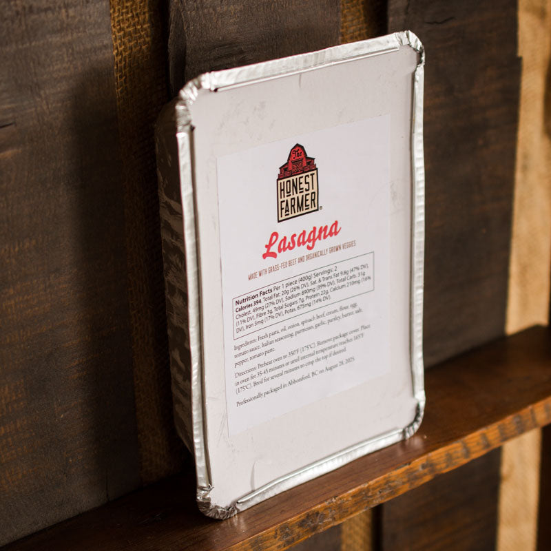 Ready-to-bake lasagne, layered with fresh noodles, handmade with regeneratively-farmed wheat, plus grass-fed beef and organic tomatoes. Keep a few in the freezer for days you need a nourishing, filling meal without having to mess up the kitchen. Generously feeds 2 adults.