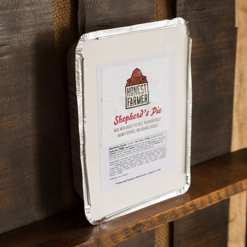 Ready-to-bake Shepherd's Pie made from grass-fed beef and regeneratively farmed potatoes and organic veggies, all held together in a delicious sauce. Keep a few in the freezer for days you need a nourishing, filling meal without having to mess up the kitchen. (Roughly feeds 2 adults). Contains soy.